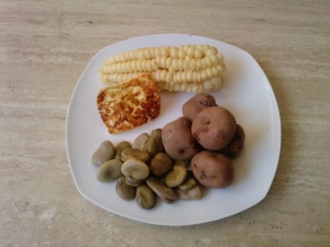 - En otra olla, la chef cocina las papas enteras, los choclos, las zanahorias, los nabos y el repollo en agua con sal hasta que estén tiernos pero firmes. Se reservan.