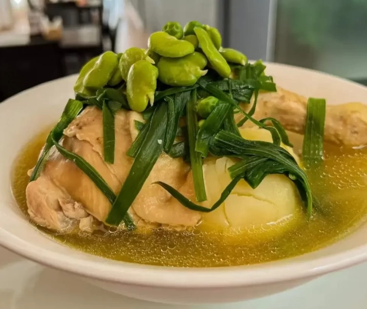 En una olla grande con aproximadamente tres litros de agua hirviendo, se colocan las presas de pollo previamente lavadas junto con el apio, el perejil, los ajos machacados y los condimentos al gusto. Se deja cocinar a fuego medio hasta que la carne esté tierna y el caldo haya tomado sustancia. En ollas separadas, se procede a cocinar las papas, las habas y las arvejas con una pizca de sal, cuidando que las legumbres mantengan su color verde vibrante y no se sobrecocinen. El elemento distintivo de esta receta es la cebolla verde; se deben lavar cuidadosamente las colas y cortarlas en trozos de aproximadamente 5 a 8 centímetros de largo. Unos cinco minutos antes de servir, se agregan estas cebollas al caldo del pollo para que se blanqueen ligeramente sin perder su firmeza ni su aroma característico. Para el emplatado, se sirve en un plato hondo una base de papas, habas y arvejas, se coloca encima la presa de pollo y se cubre con abundante caldo y las colas de cebolla verde.