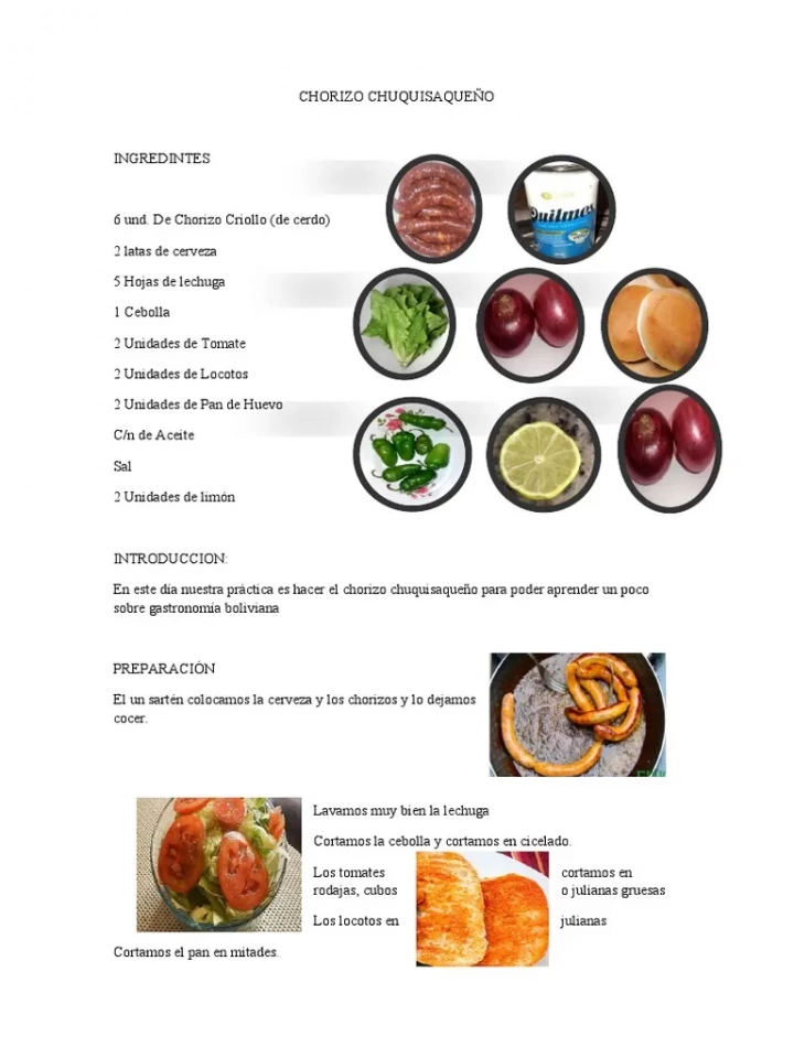 En una sartén amplia se vierte una taza de agua y se colocan los chorizos. Se dejan hervir a fuego medio para que se cocinen internamente. Una vez que el agua se evapora por completo, se añade un chorrito de aceite y se fríen los chorizos en su propia grasa hasta que la piel esté dorada y crujiente, cuidando de no pincharlos en exceso para mantener su jugosidad. Mientras tanto, se prepara una ensalada fresca (sarsa) mezclando la cebolla pluma, el tomate y el locoto, sazonando con sal, un chorrito de vinagre y las hojas de quirquiña picadas. Las papas, previamente cocidas, se pueden saltear unos minutos en la misma sartén de los chorizos para que adquieran color y sabor. El mote de maíz blanco se calienta en agua hirviendo y se escurre. Para servir, se coloca el chorizo sobre un trozo de pan, acompañado de una papa, una porción generosa de mote y se corona con la ensalada de cebolla y tomate fresca.